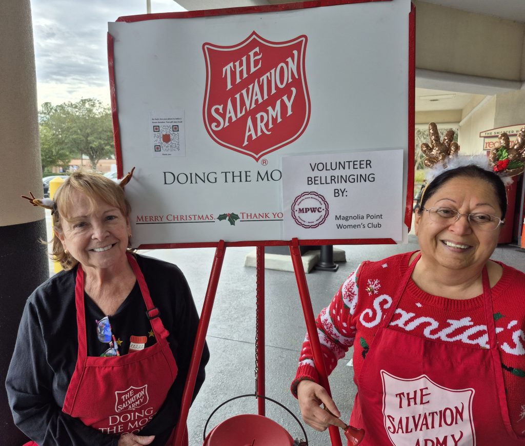 MPWC members volunteer to ring bells each year at Winn Dixie on 17. The first crew kicking off the season was Susan Hanline and Anne Bastress. Our outreach chair, Jackie Maneval, was on site making sure it was ‘all systems go’. Within minutes, the first donator showed up. Thank you also to Diane Dearth, Kimberly LaPorte, Cindy Triay, Cheryl Smith, Sandy Waldrup and Bobbe Marion who will work the bells on Thursday and Friday of this week.